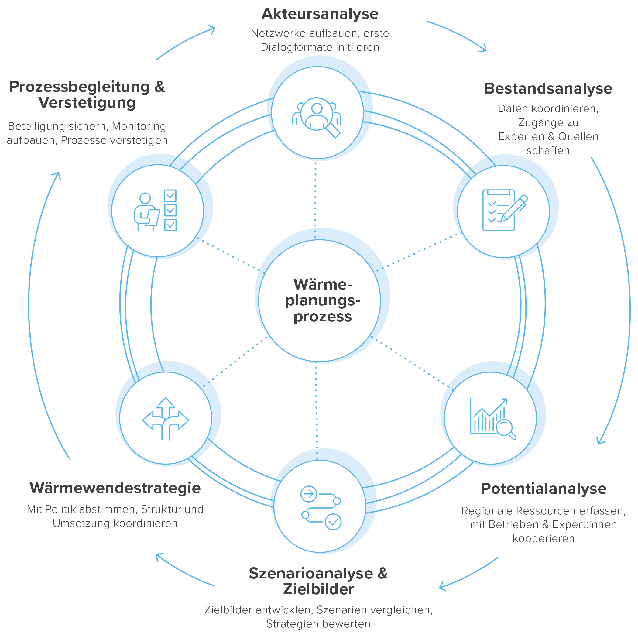 The municipal heat plan includes a comprehensive assessment of the building stock, existing heat infrastructure and renewable heat potentials. Based on this, target scenarios for 2030 and 2040 are developed, priority areas for building renovation and heating system replacement are identified, and an action plan with monitoring framework is defined.