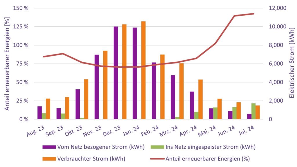 Die Wärmepumpenlösung, führte in Kombination mit einer PV-Anlage zu einer signifikanten Steigerung bei der Nutzung erneuerbarer Energien. So konnte, messtechnisch bestätigt, der jährliche Anteil erneuerbarer Energien von 42 % vor der Umrüstung auf 76 % nach der Installation erhöht werden.