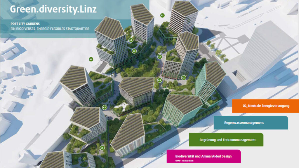 Im nun abgeschlossenen Sondierungsprojekt Green.diversity.Linz wurde dazu ein systematisch aufeinander abgestimmtes Gesamtkonzept für die Planung eines solchen zukunftsfähigen Stadtteiles entwickelt. Konkret wurde das Umsetzungskonzept für das ehemalige Postverteilerzentrum neben dem Linzer Bahnhof erstellt, für das seit 2019 eine grundlegende Transformation von praktisch vollständig versiegeltem Leerstand hin zu einem gemischt genutzten Quartier mit künftig ca.150.000 m² Bruttogeschoßfläche geplant wird.