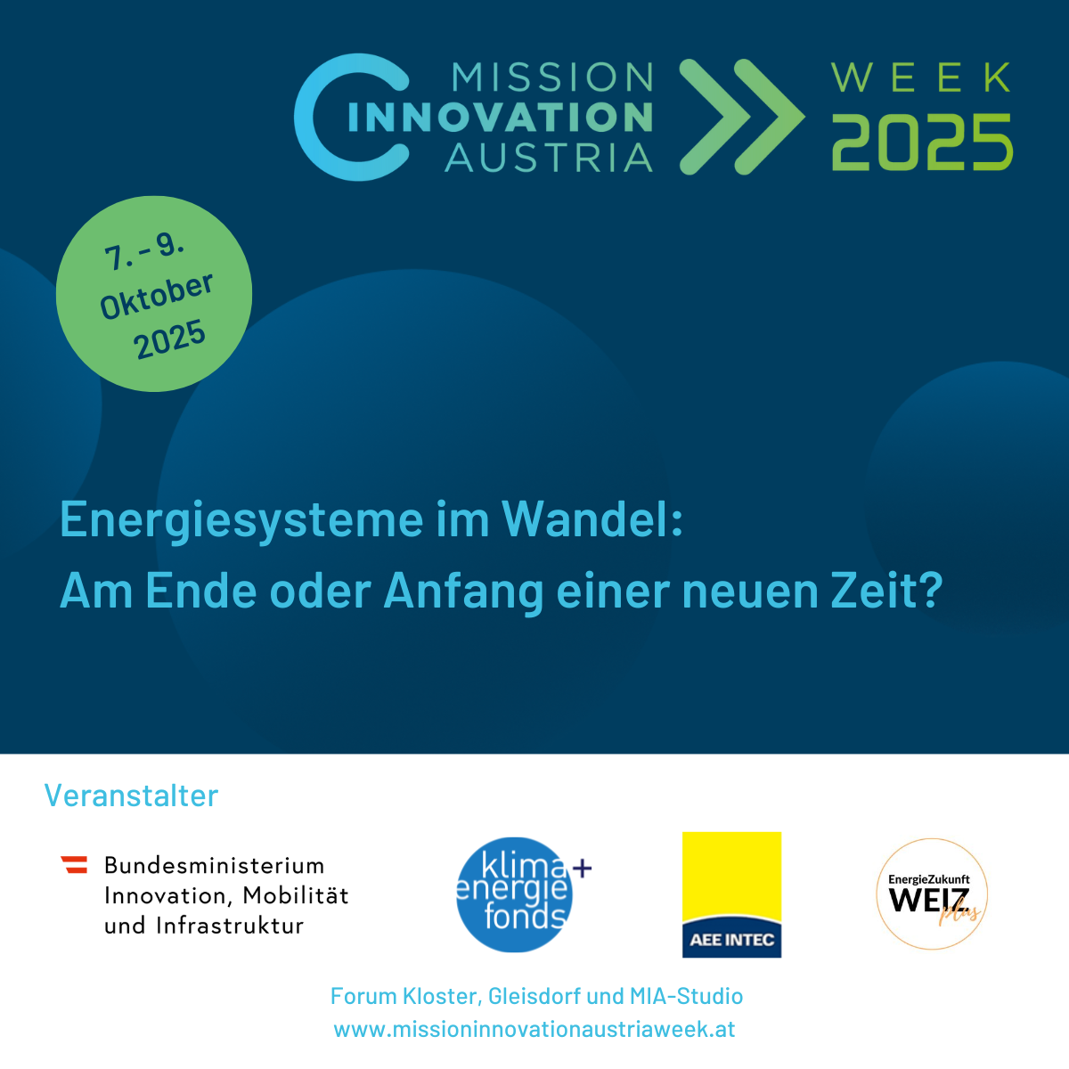 Vom 7.–9. Oktober 2025 wird die Region WEIZplus zum Zentrum der österreichischen Energiewende, denn die Mission Innovation Austria Week 2025 (MIA 2025) findet erstmals in Gleisdorf statt – eine Auszeichnung für unsere Arbeit und die Innovationskraft unserer Region.